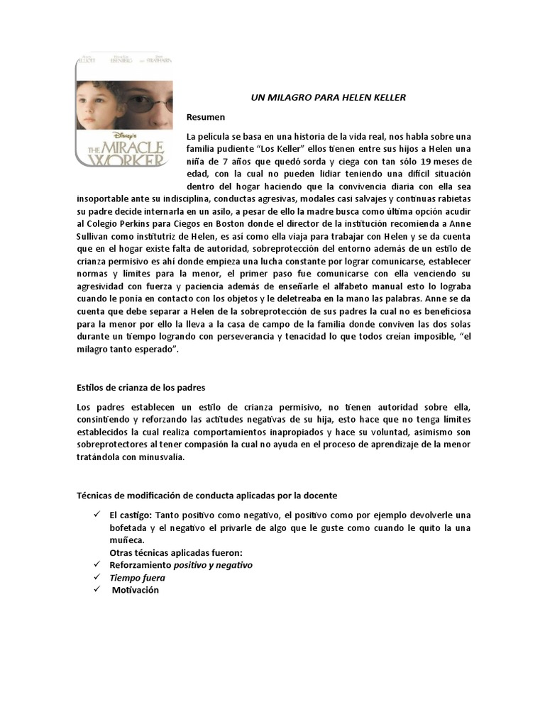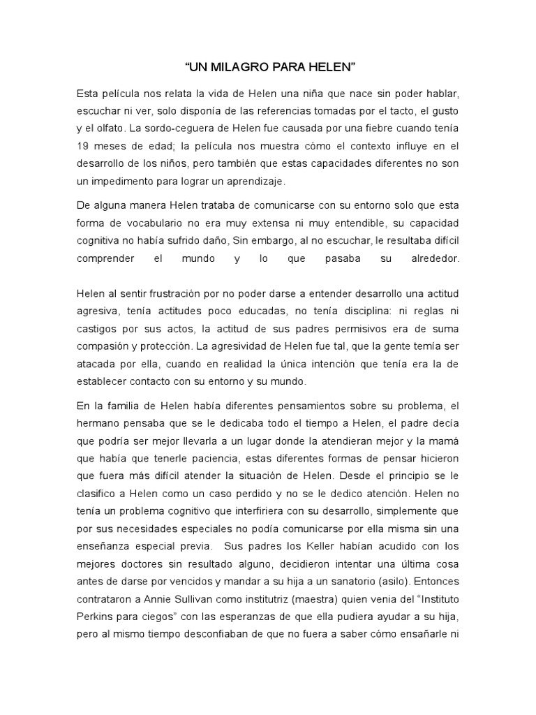 El argumento nos muestra la llegada de Anne Sullivan una maestra de convicciones firmes- a la casa de Helen. Hablaremos de la película de Un milagro para Helen quien tiene una discapacidad y como va desarrollando con el tiempo con ayuda de su institutriz Ann Sullivan que hace todo lo que puede para que la niña aprenda el lenguaje de los sordomudos y pueda comunicarse con su familia evitar que siga siendo una niña agresiva debido a su distanciamiento respecto a la capacidad. El Milagro De Helen Keller. El milagro de Helen Keller Introducción Encargarse de una tarea casi imposible. Una familia contrata a Anna Sullivan para educar a Helen una niña sorda y ciega. Ambas actrices obtendrían el Oscar por esta interpretación. Helena tiene atrofia muscular y mejora gracias al remedio más caro del mundo El 16 de diciembre en el Hospital Italiano de Buenos. Analisis el milagro de Helen Keller by Juan Pablo Vazquez Ruiz. La película cuenta la historia de Helen Keller una jovencita ciega y sorda y su maestra Annie Sullivan quien con amor y paciencia le enseñó a leer y hablar.
